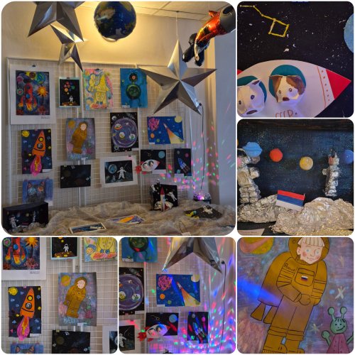 В преддверии этого празднника в актовом зале первого корпуса открывается уникальная экспозиция — выставка детских рисунков и поделок «Космос нашими глазами». Давайте посмотрим какие красивые рисунки и работы представили наши ребята с педагогами!